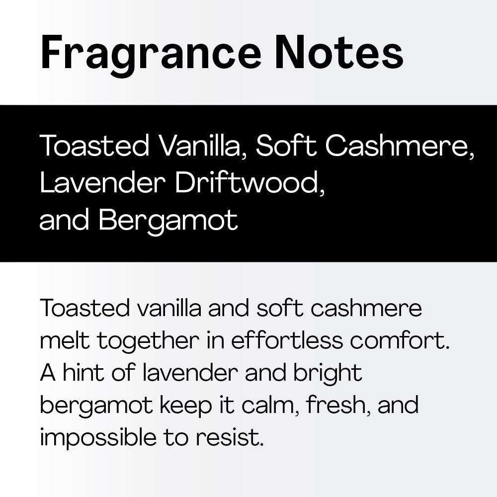 Toasted vanilla and soft cashmere melt together in effortless comfort. A hint of lavender and bright bergamot keep it calm, fresh, and impossible to resist.